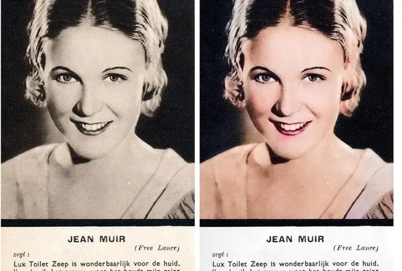 De foto van de ansichtkaart doet vermoeden dat de kaart jonger is dan 1938 want zo zag Jean Muir er in 1938 uit: